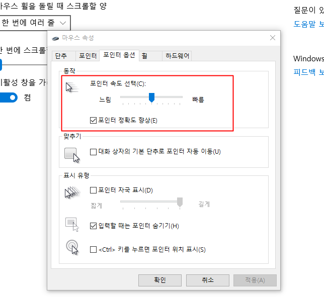 아래의 포인터 정확도 향상이라는 항목은 마우스를 움직일 때 가속을 주는 옵션인데요.